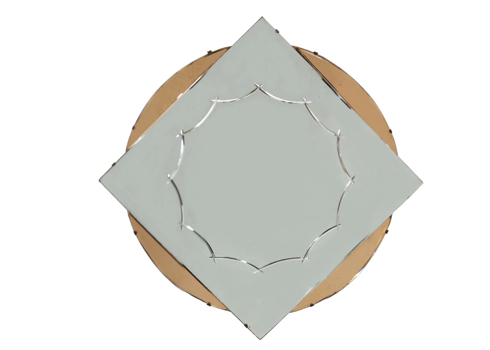 1930s era Art Deco style frameless wall mirror. Wall mirror features a diamond shaped central mirror with reverse cut geometric design surrounded by a rose gold frame with faceted beveled edge. Backing is wood with a chain for hanging. Made in the UK.