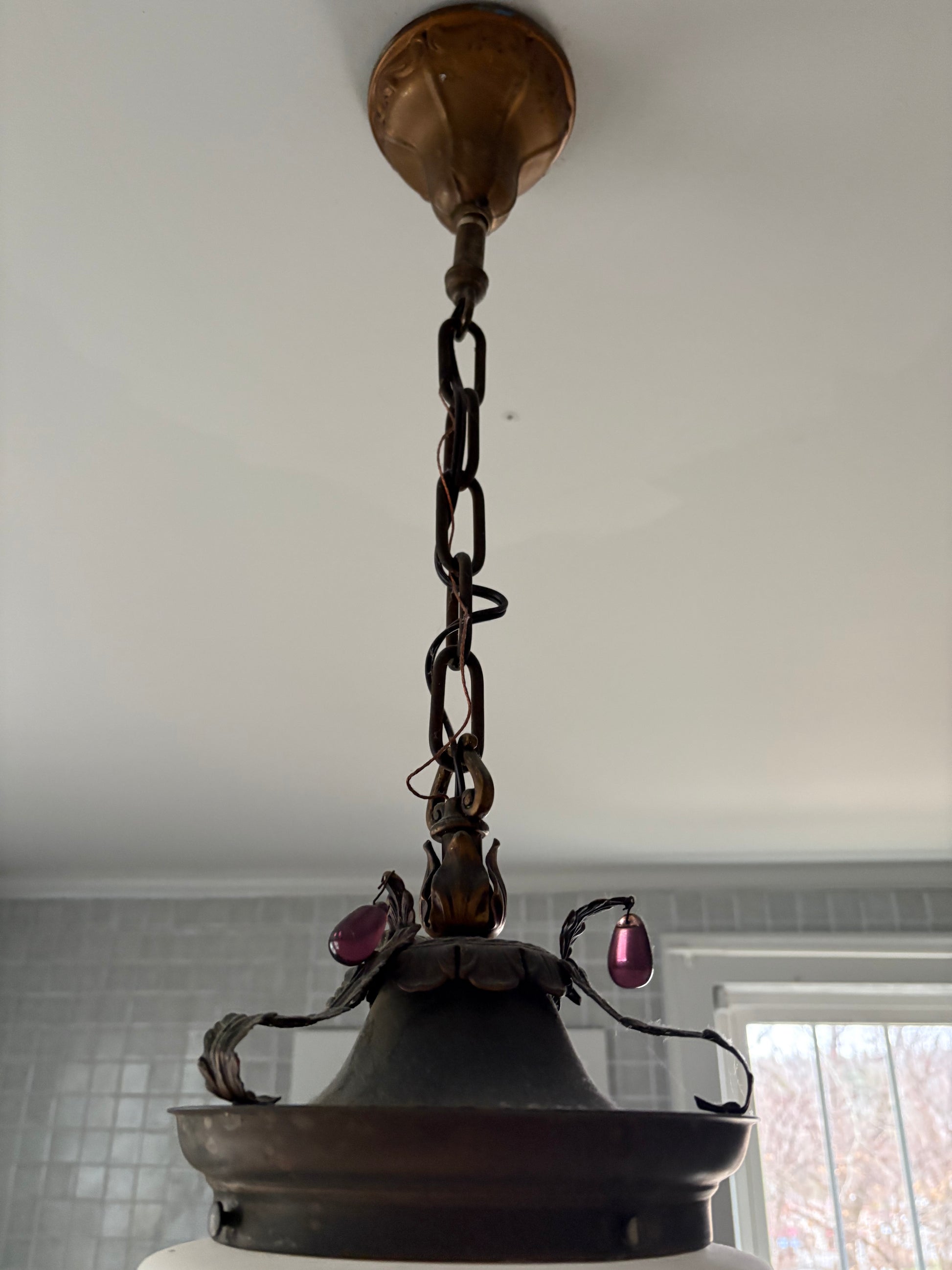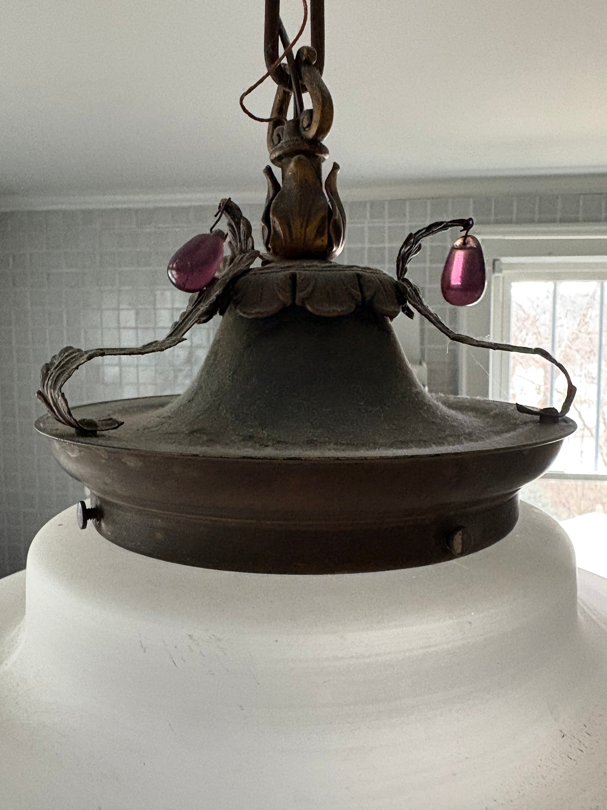 1930s era hardwired pendant light. Original ribbed glass globe affixes to an aged brass socket canopy with matching chain and ceiling canopy. Socket canopy has subtle leaf details and 3 purple glass ornaments. Newly rewired with canopy bar welded to fixture for safe and secure hanging. This is perfect for a historic home or to add character to any home.