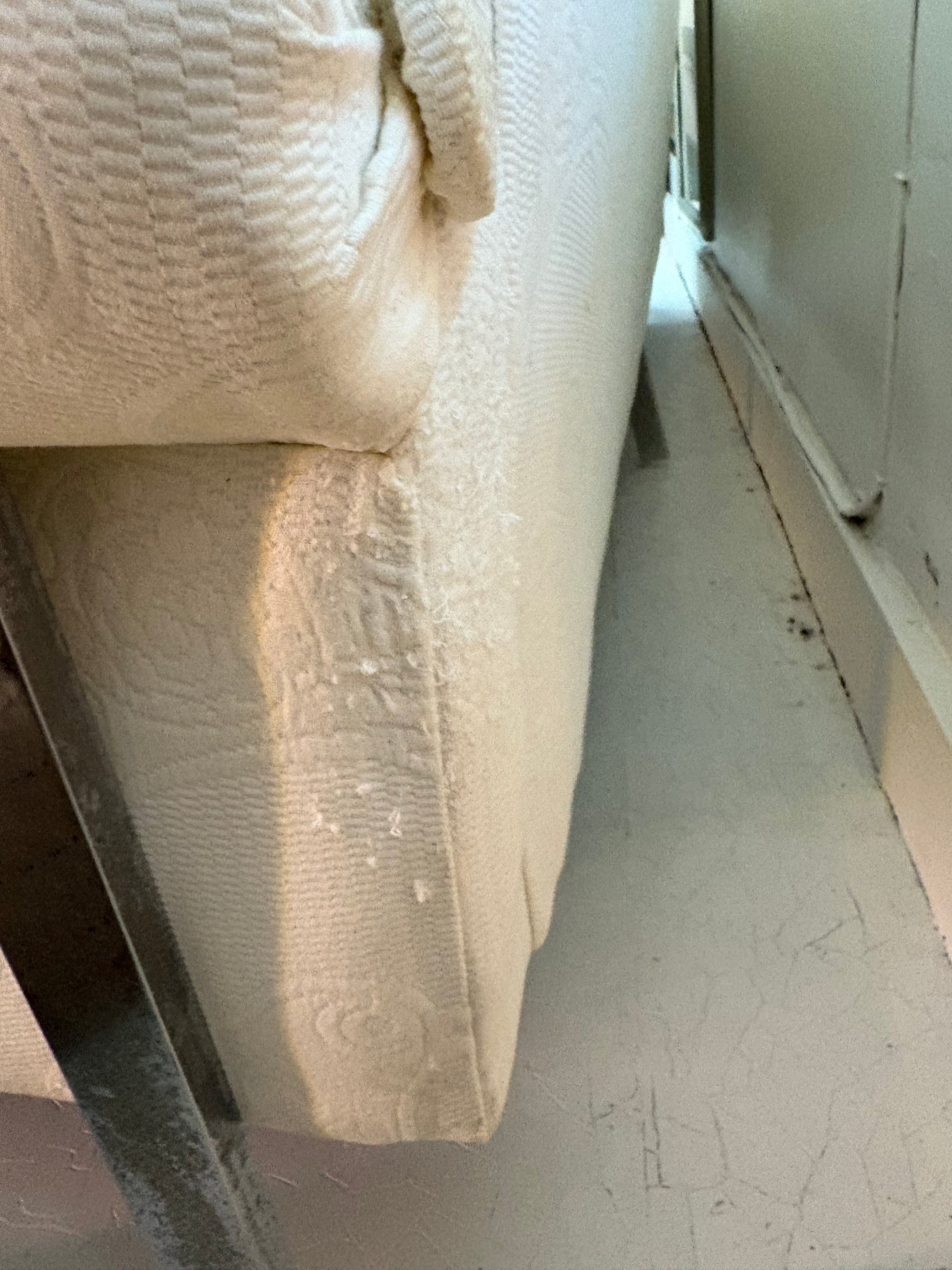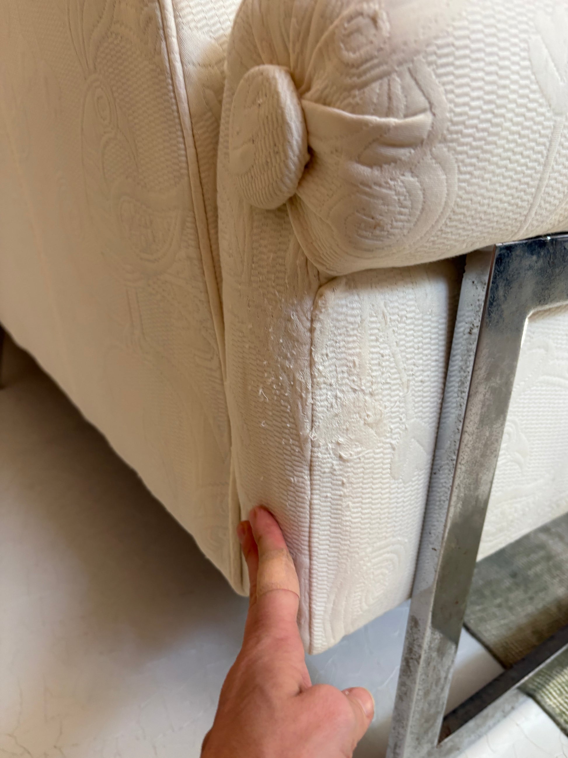 CONDITION: fabric is nearly pristine with cat scratch marks on the back of both arms. See photos. Chrome is in good shape without pock marks