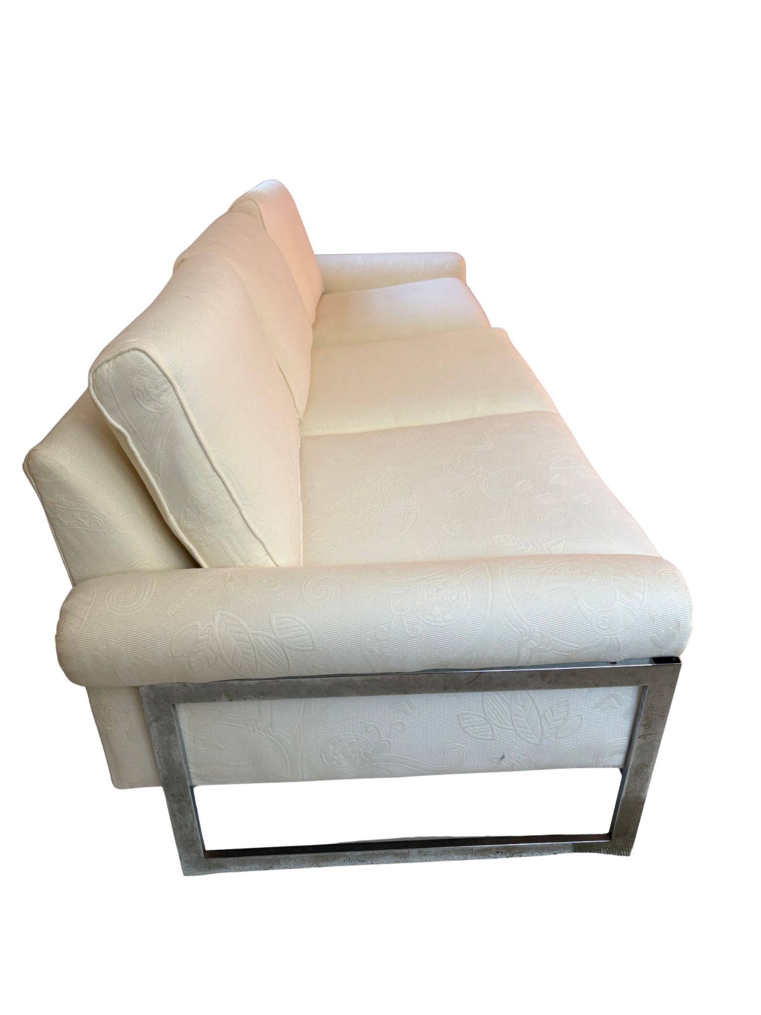 Mid century modern, Milo Baughman style chrome three seater couch. Covered in a whimsical quilted fabric with birds, vines and dragonflies. Cushions and covers are removable. Firm yet comfortable seating. Solid construction. 1960s era.
