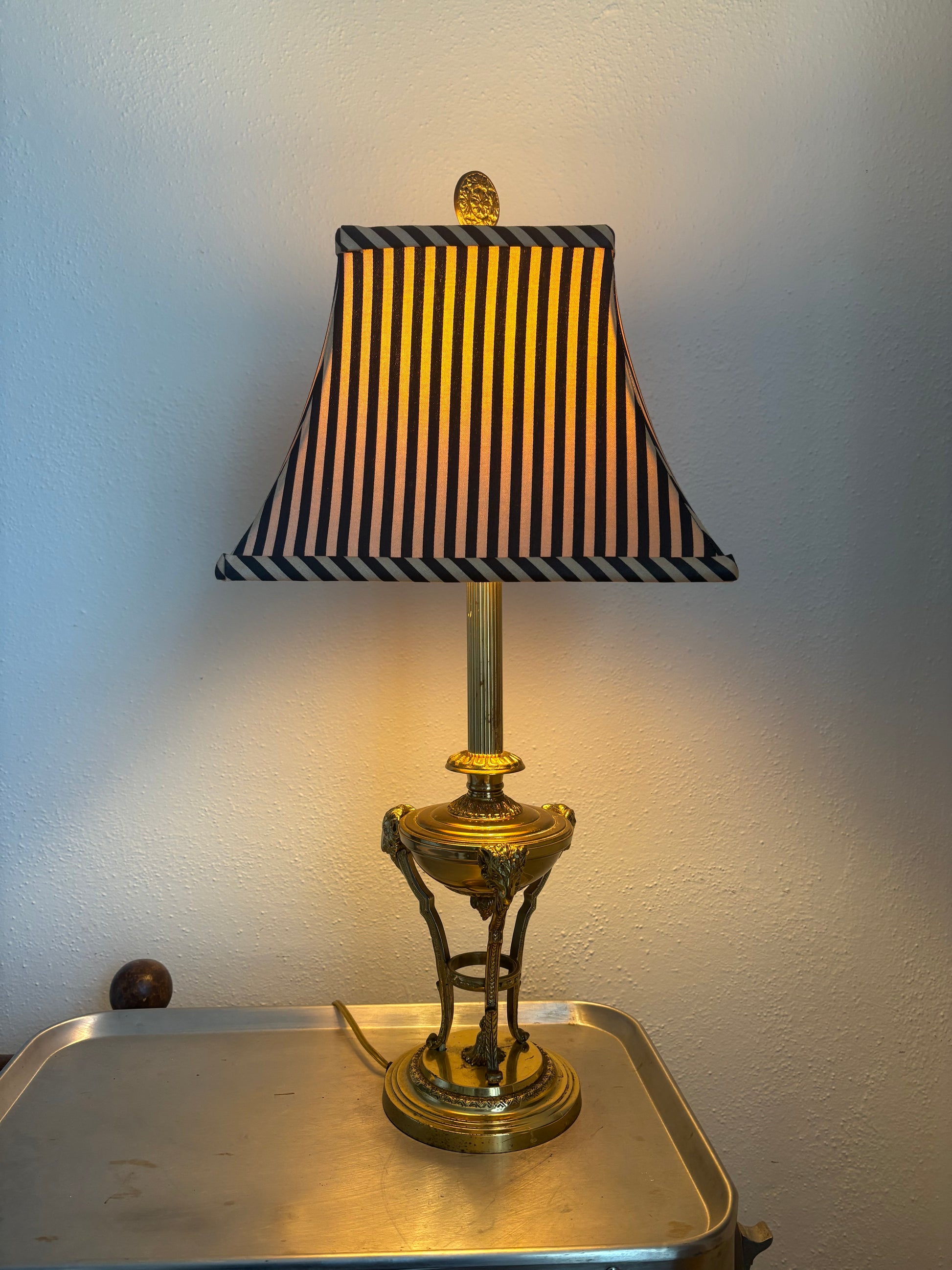 1960s Hollywood Regency Brass Ram Lamp with Silk Striped Shade (FREE SHIPPING)