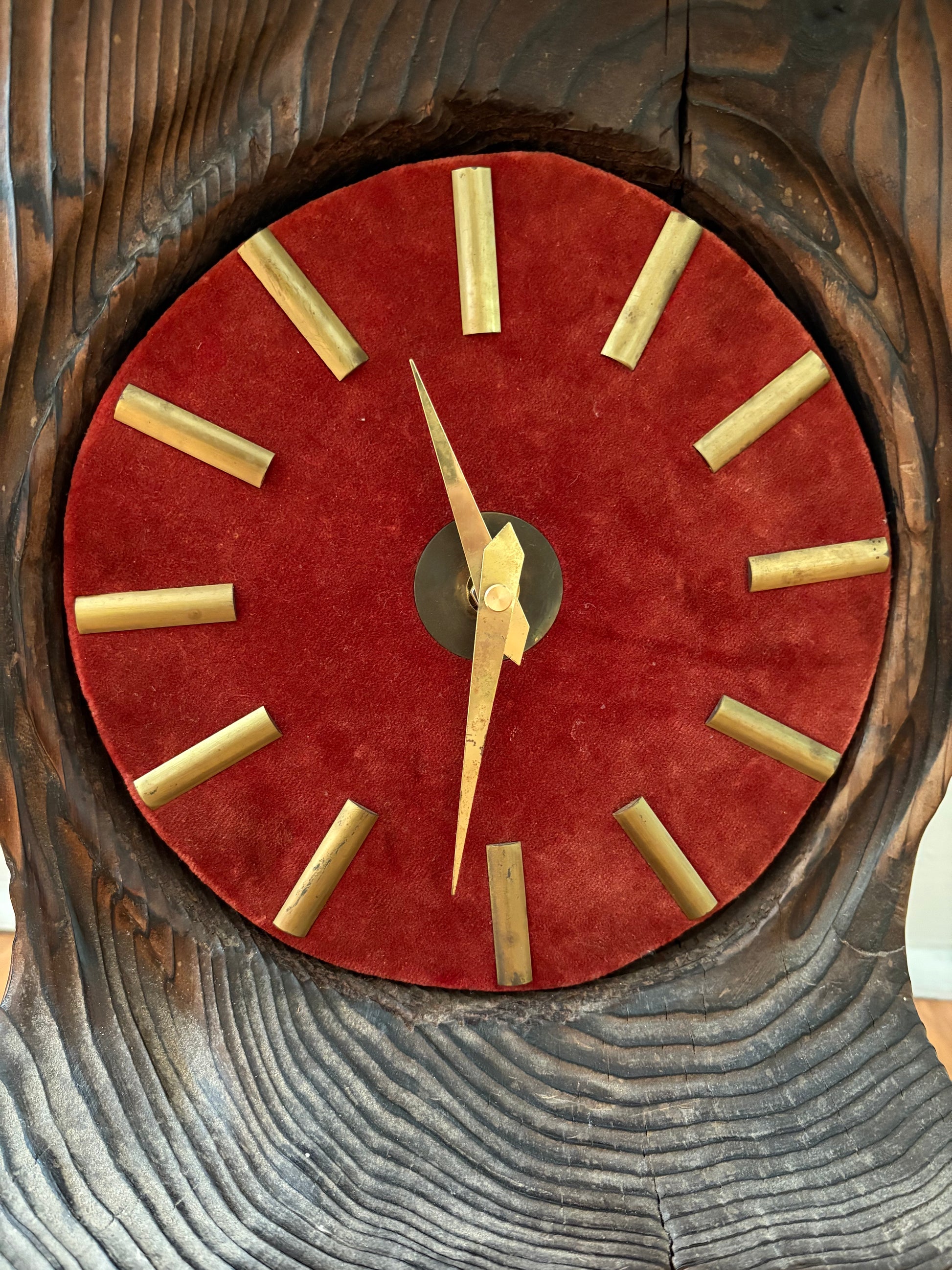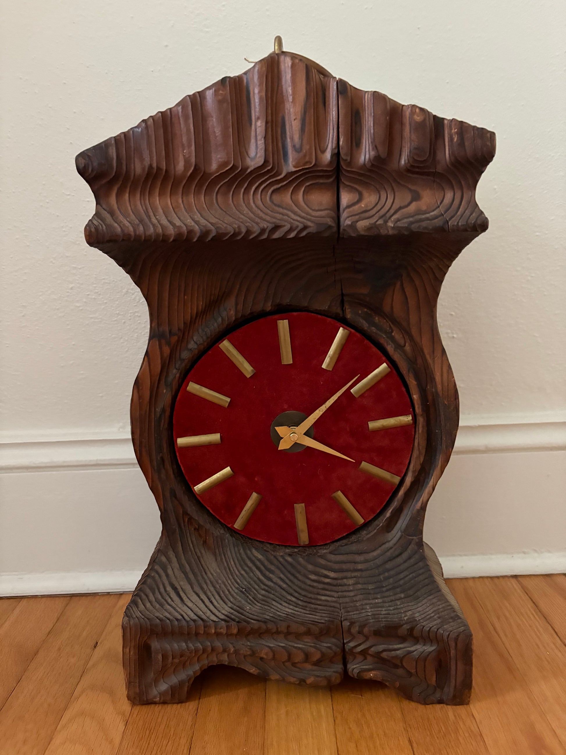 Handmade carved wood folk art clock with updated clock mechanism and battery. 1970s era. Substantial size and weight (close to 15 lbs). Maroon velvet clock face with brass details.