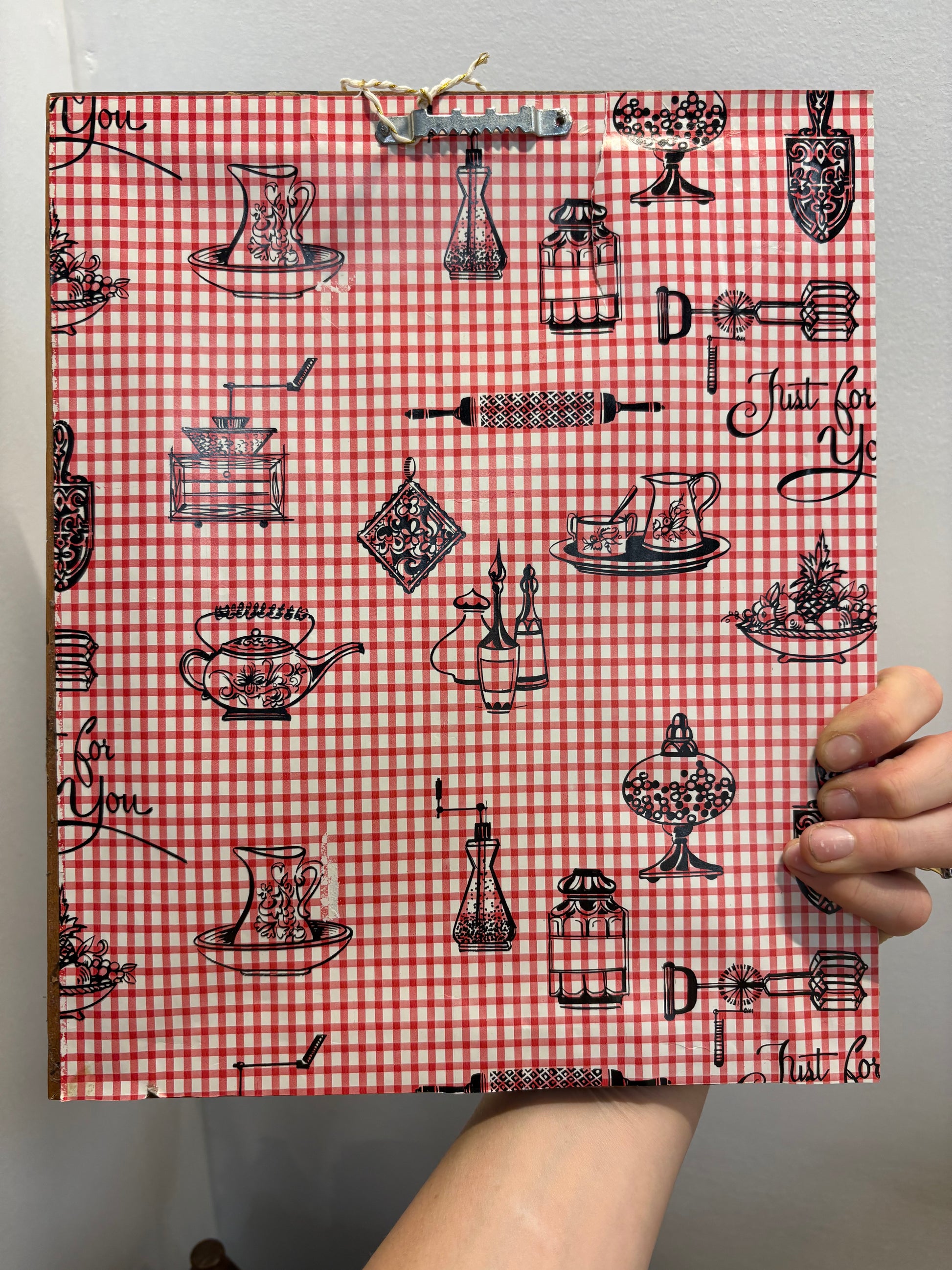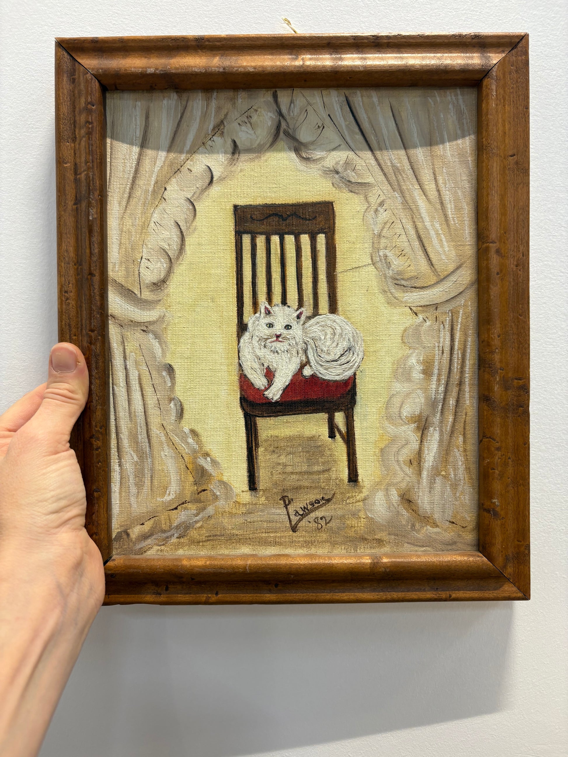 Folk art seated cat framed by curtains. Signed Pawson and dated 1982. Vintage wallpaper backing with hook for hanging.