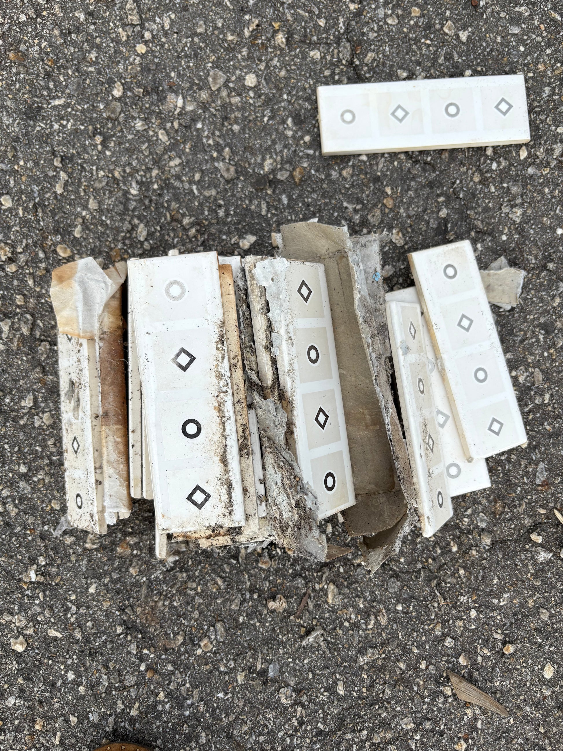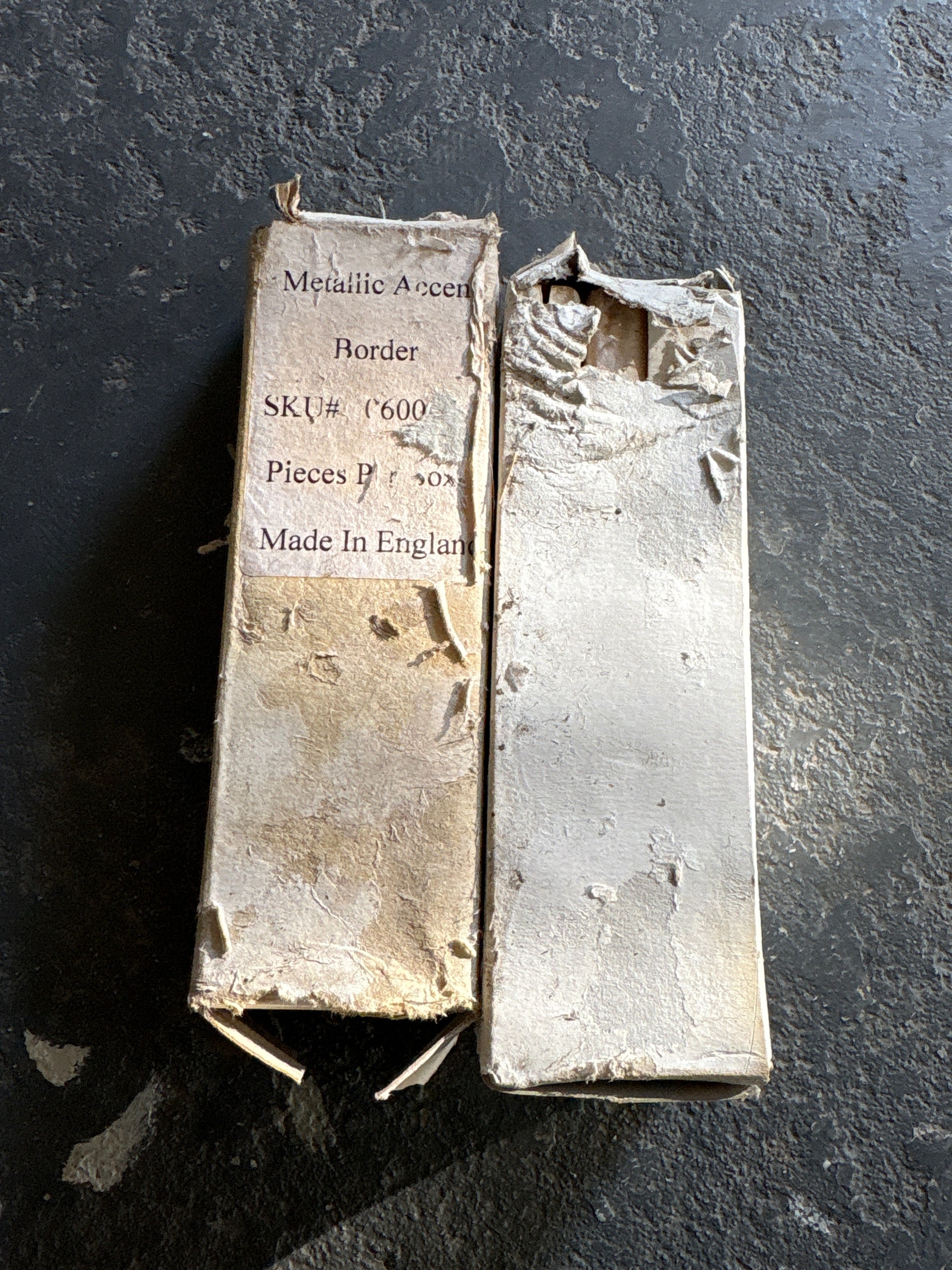 White tiles with four, slightly metallic white squares containing 18 ct platinum inlays of diamonds and circles. Tiles are made in England and retail for $15 per tiles. Each box contains 6 tiles and this listing is for 5 boxes. Boxes have suffered water damage and tiles may need to be hosed down but are in good condition. Sold as is.
