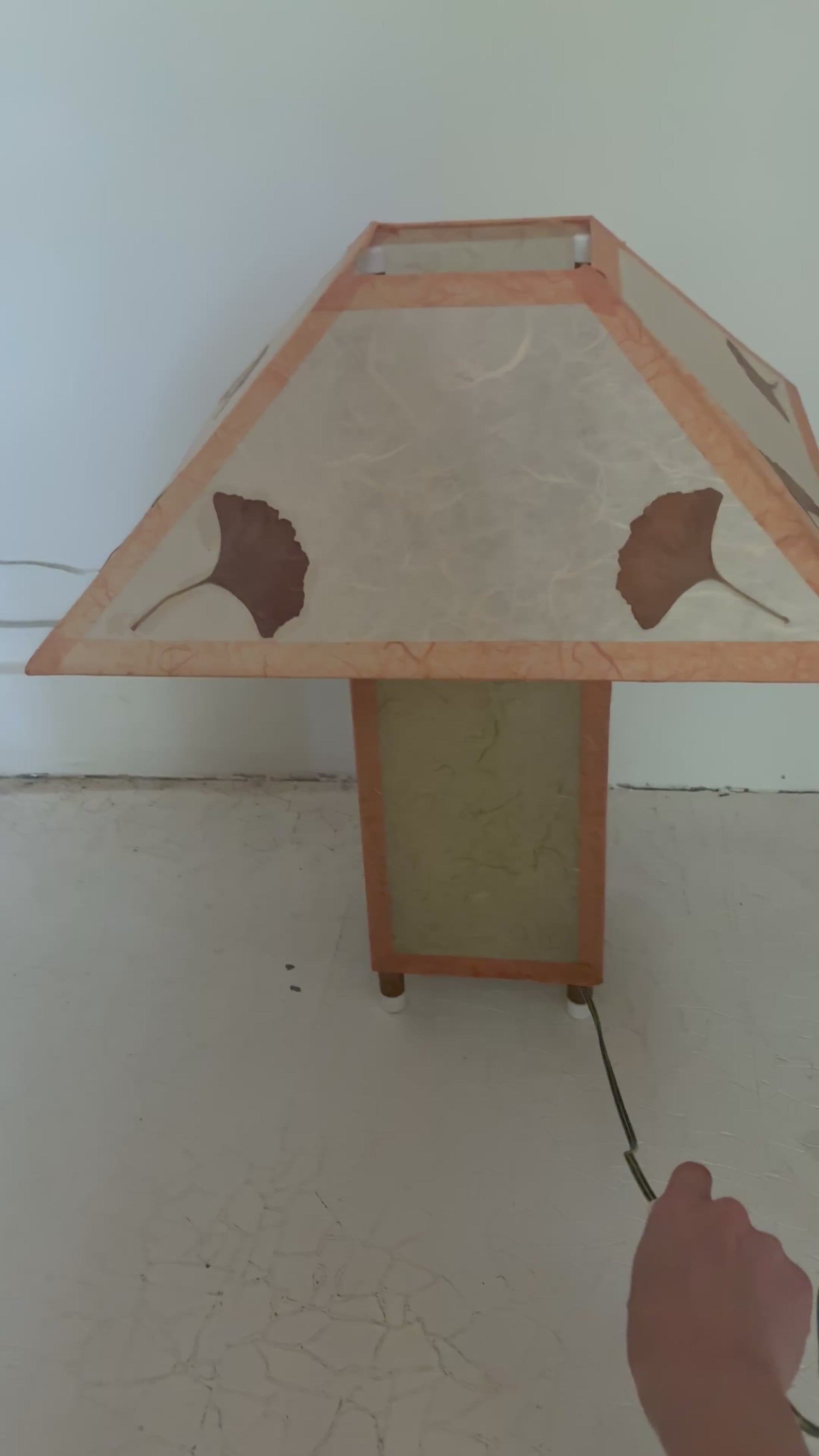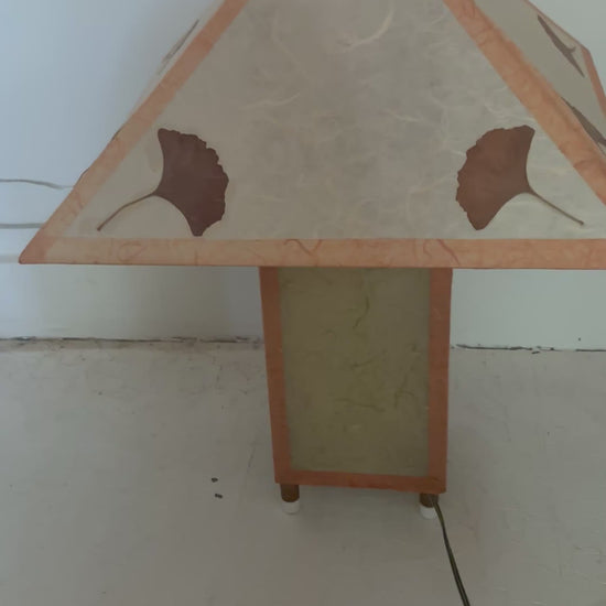 Arts and crafts meets Japandi style lamp hand crafted from acrylic pieces covered in rice paper and a copper structure with gingko leaf accents. Two bulbs create a warm glow through the rice paper. Would look great as a sculptural light piece on the floor.