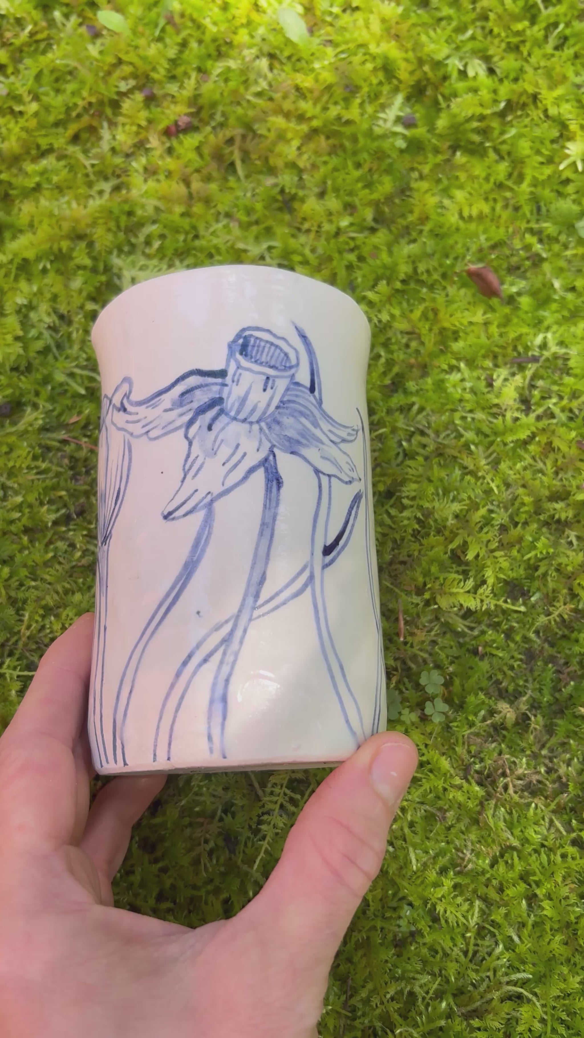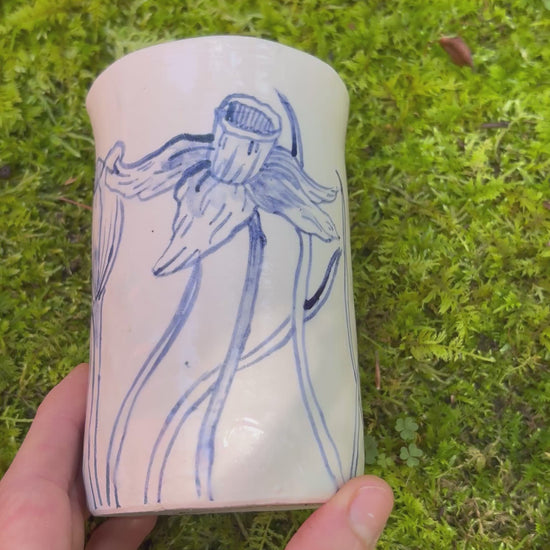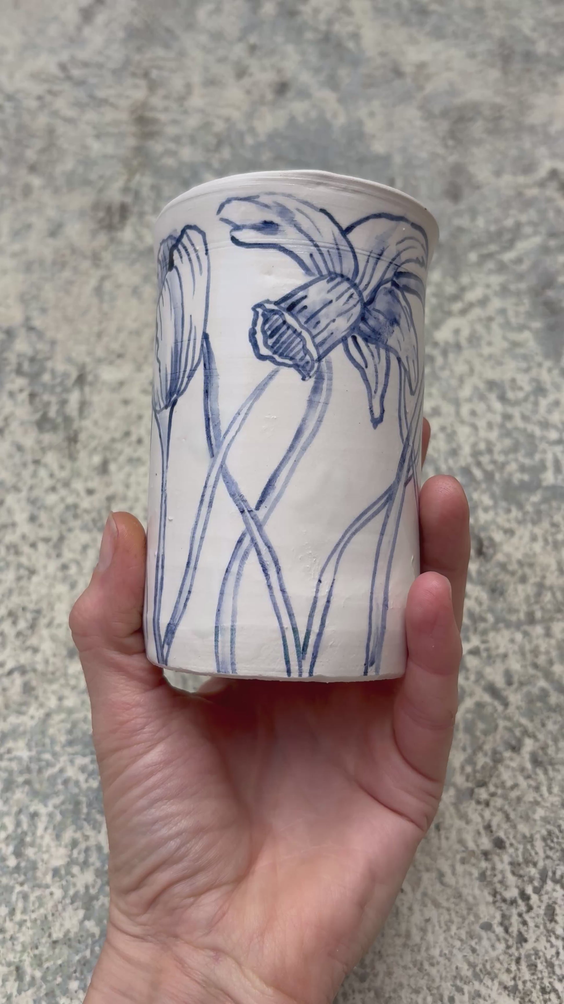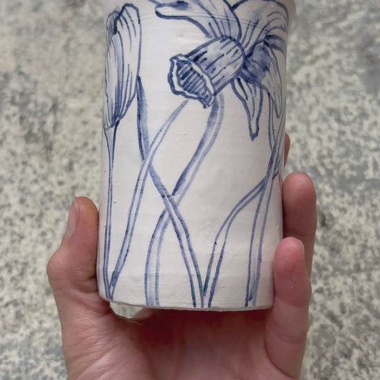 Handpainted and crafted floral vase with daffodils and tulips in a delft style. Glazed interior and exterior. Would be perfect for holding toothbrushes, art supplies or dried florals.