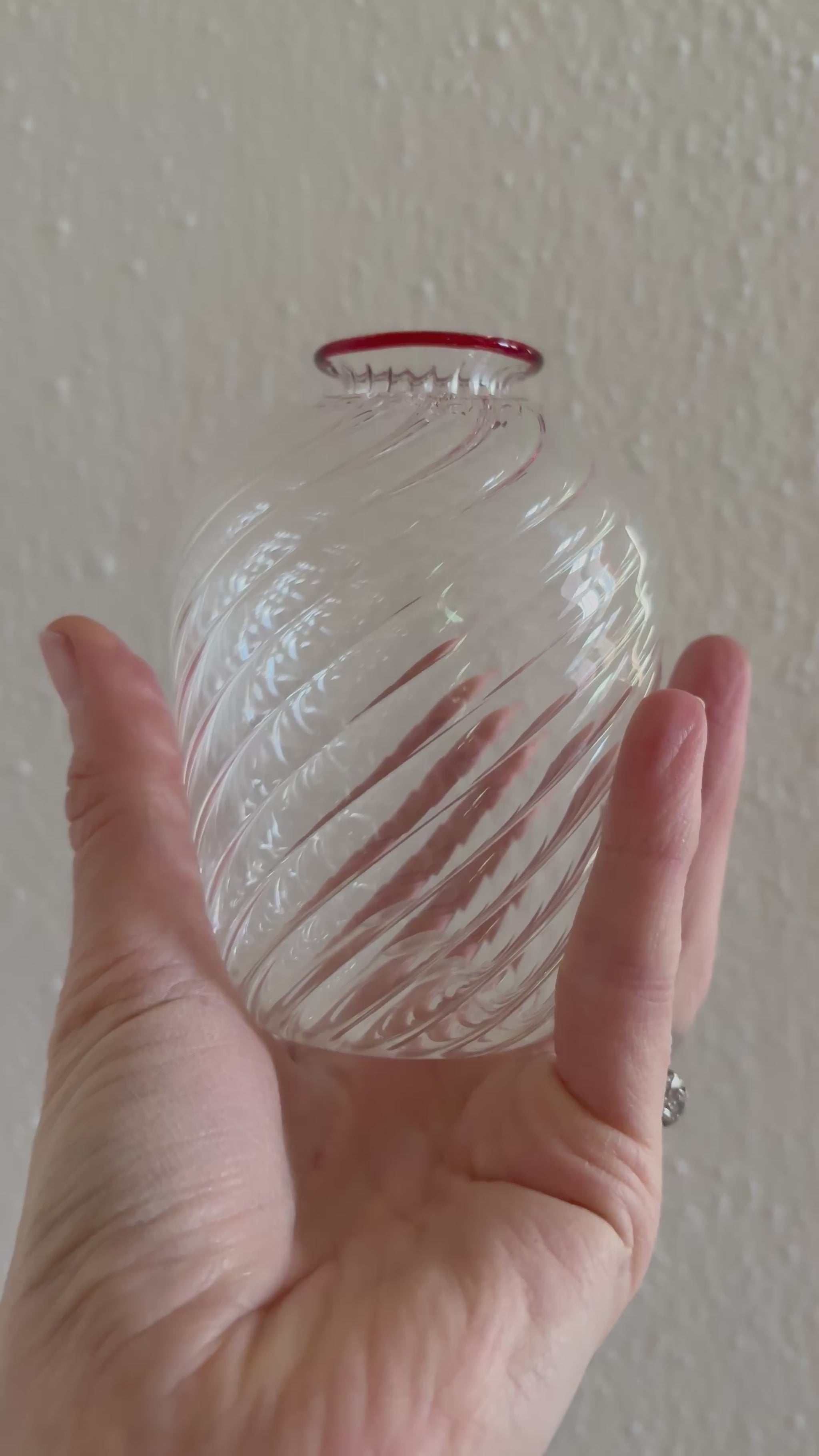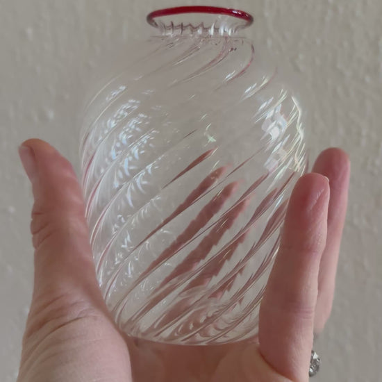 Small handblown glass with delicate spiraling detail inside. Delicate construction that catches and disperses light. Red rim on top.