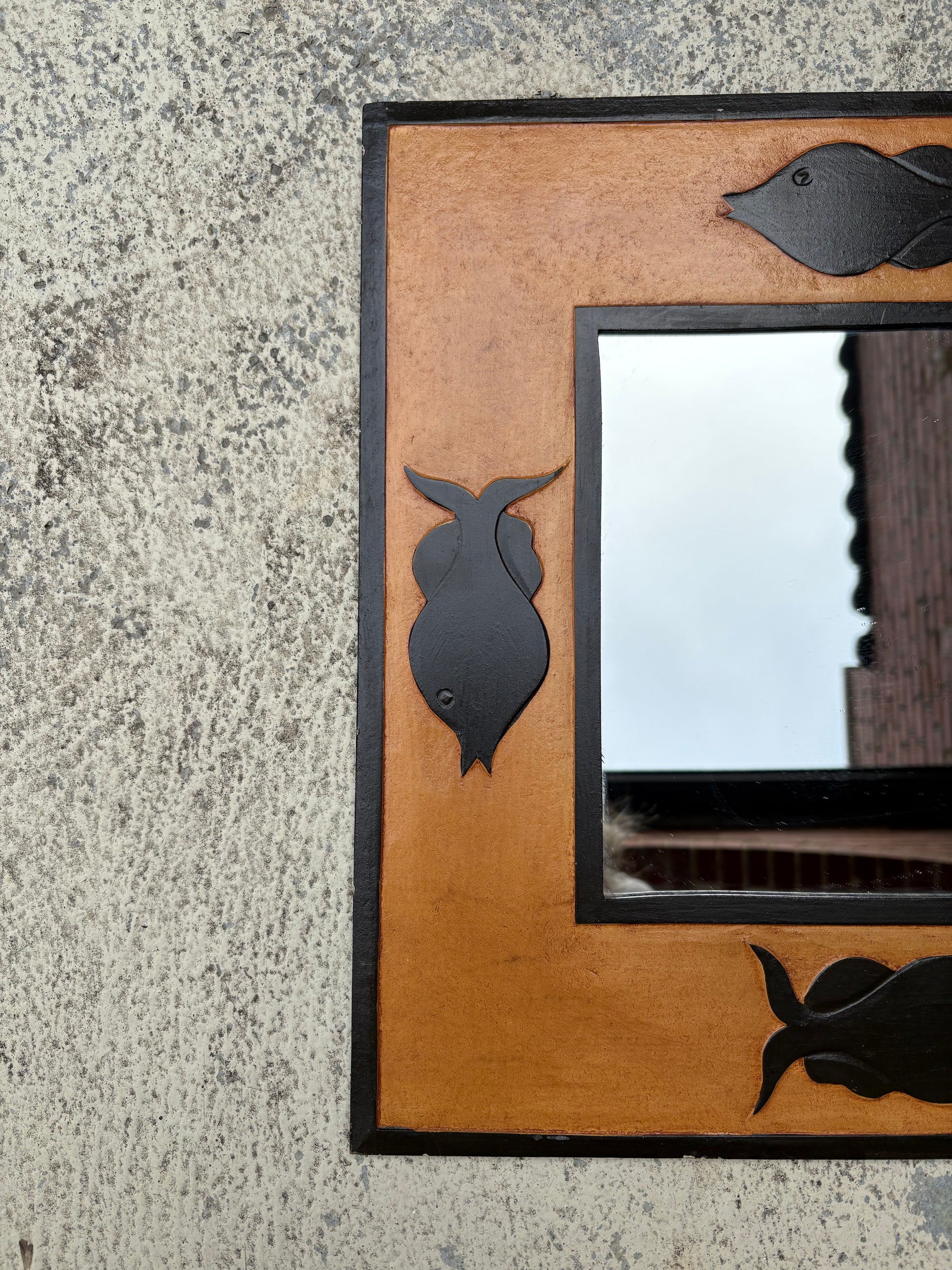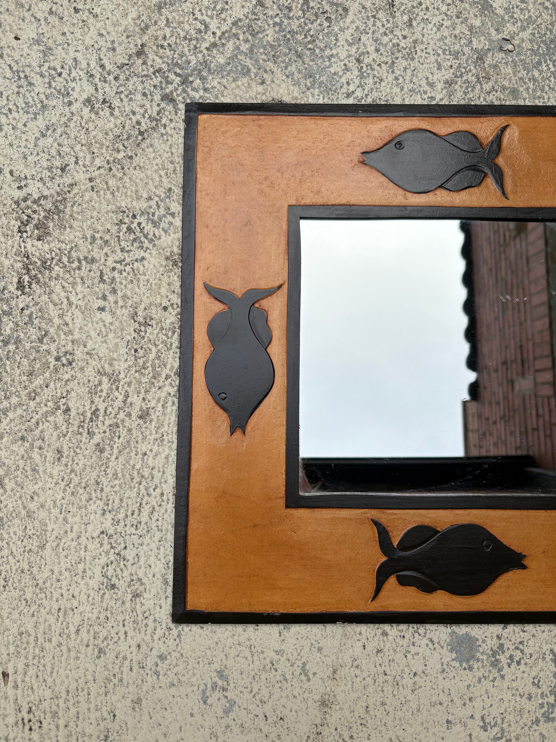 Hand carved folk art mirror with four fish painted black on a goldenrod background. Made in Indonesia.