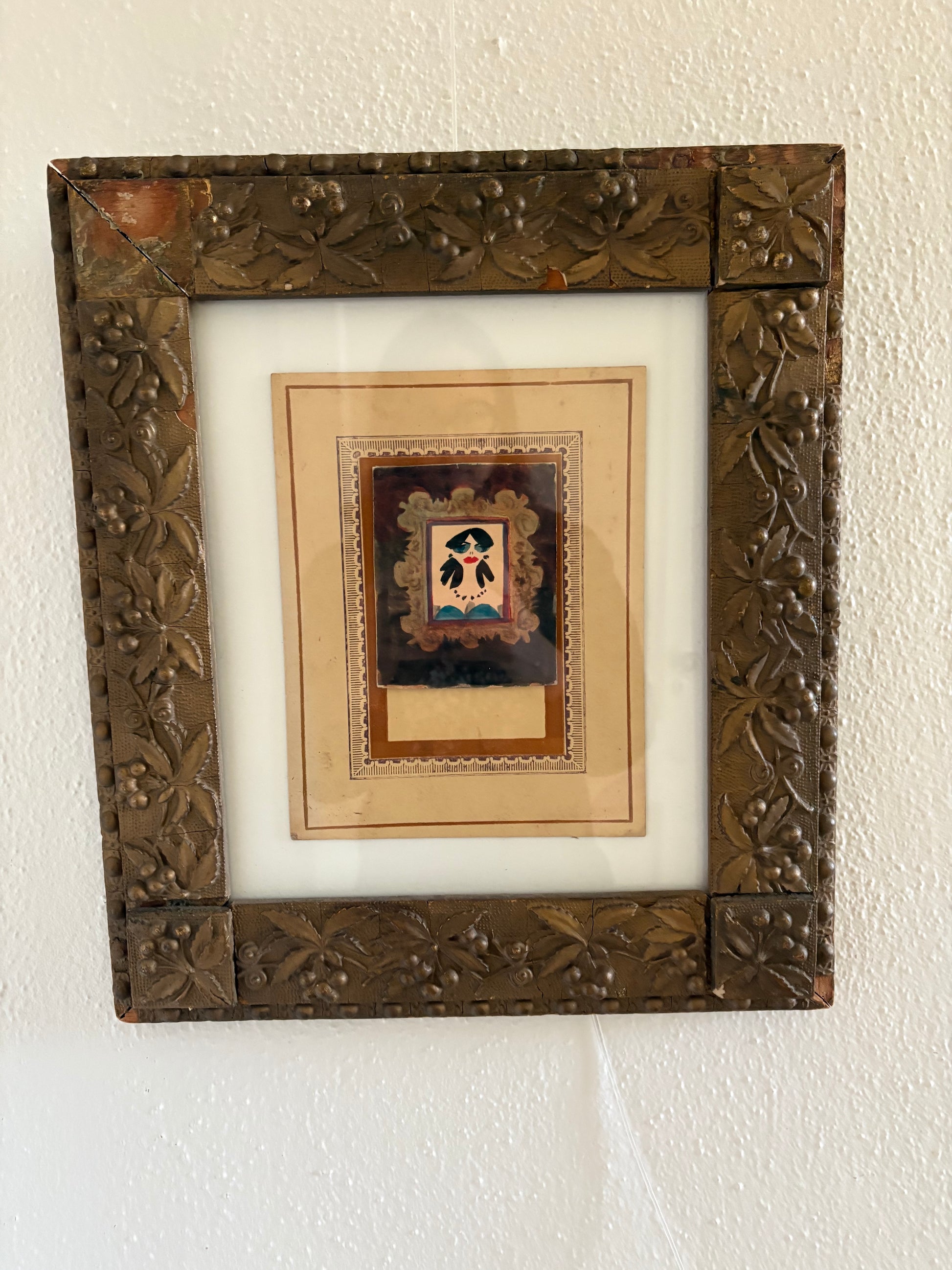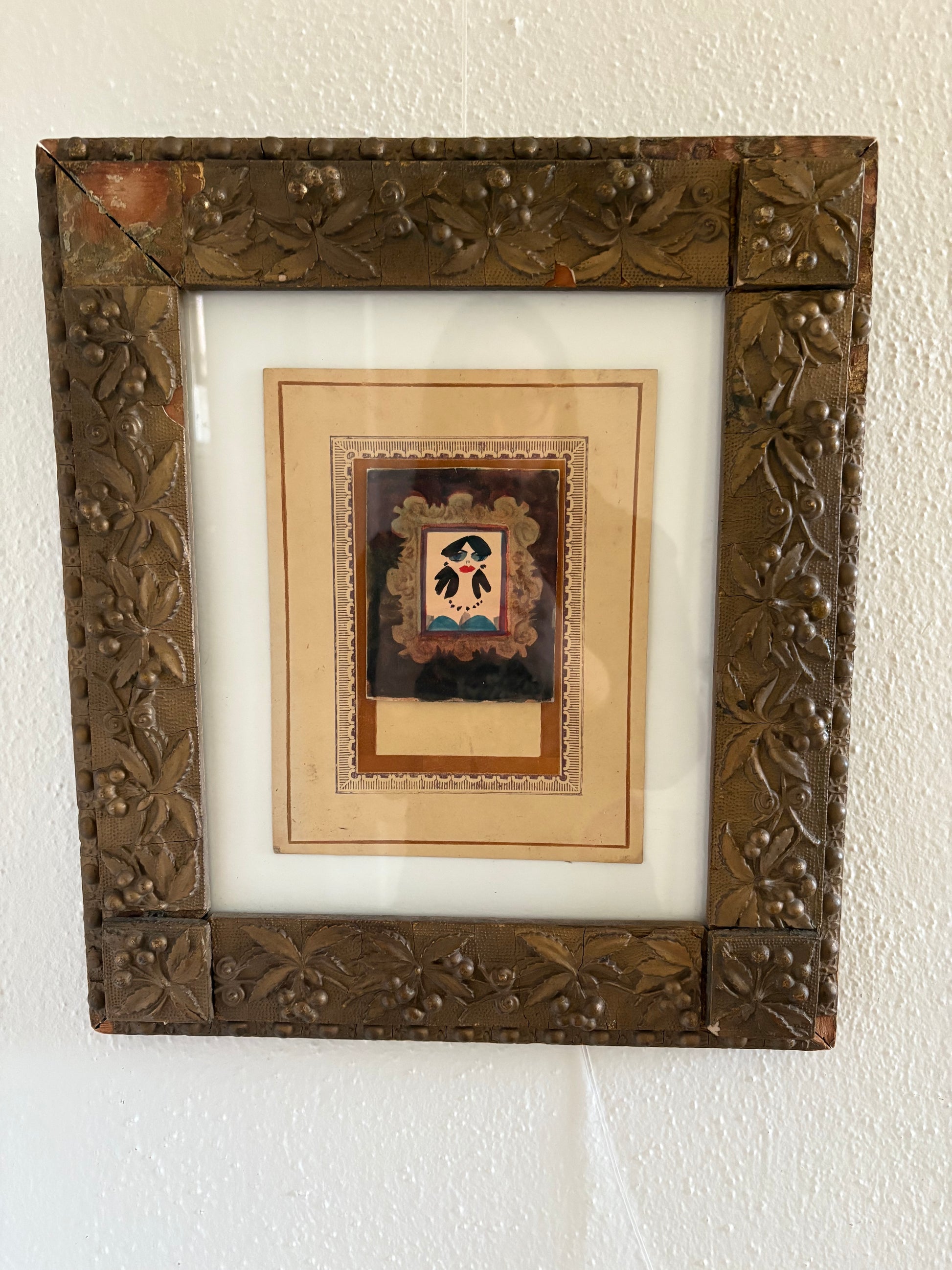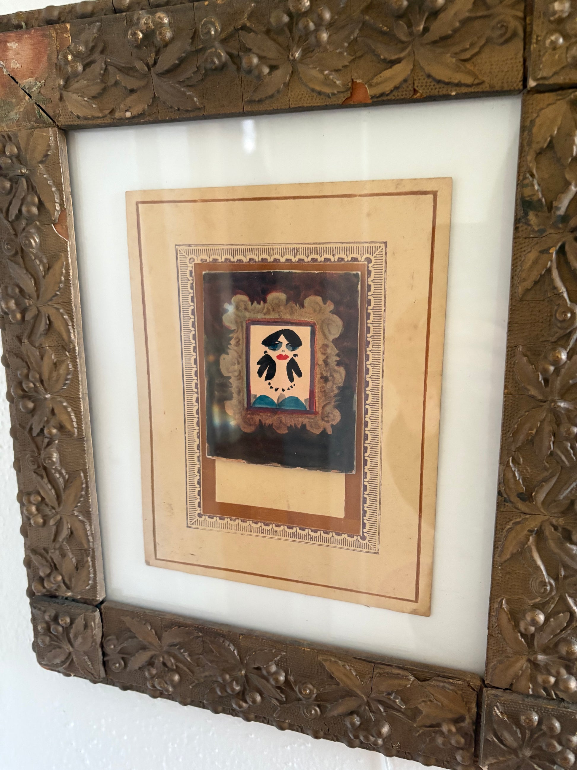 Miniature watercolor portrait floating on an antique block printed mat surrounded by white mat and antique electrum frame with botanical embellishments.