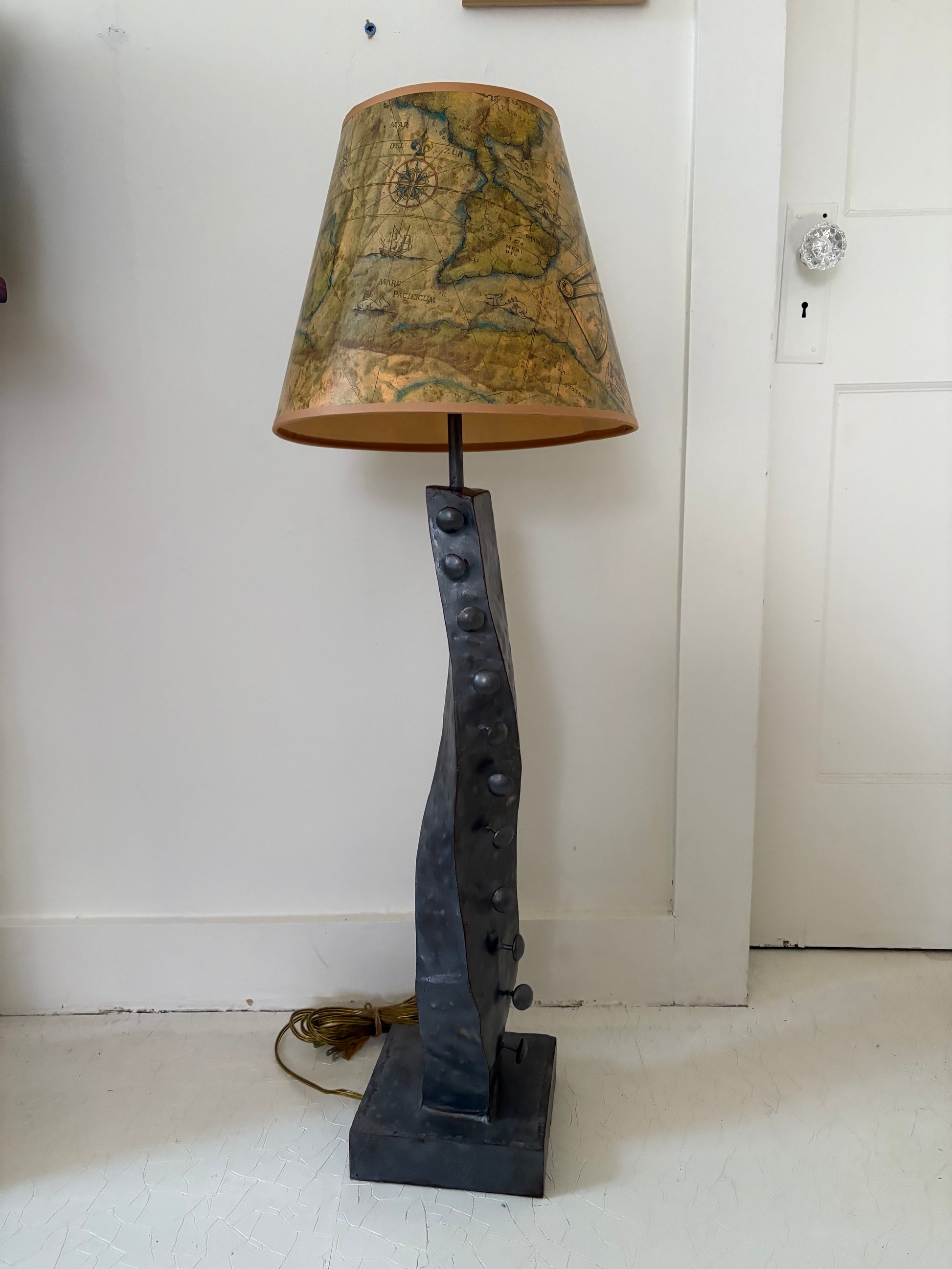 Modernist hammered metal lamp with twisted form and “thumbtack” detailing. Leans industrial but can fit in many home styles. Completed by a 1950s atomic style fiberglass lamp shade and wood finial.