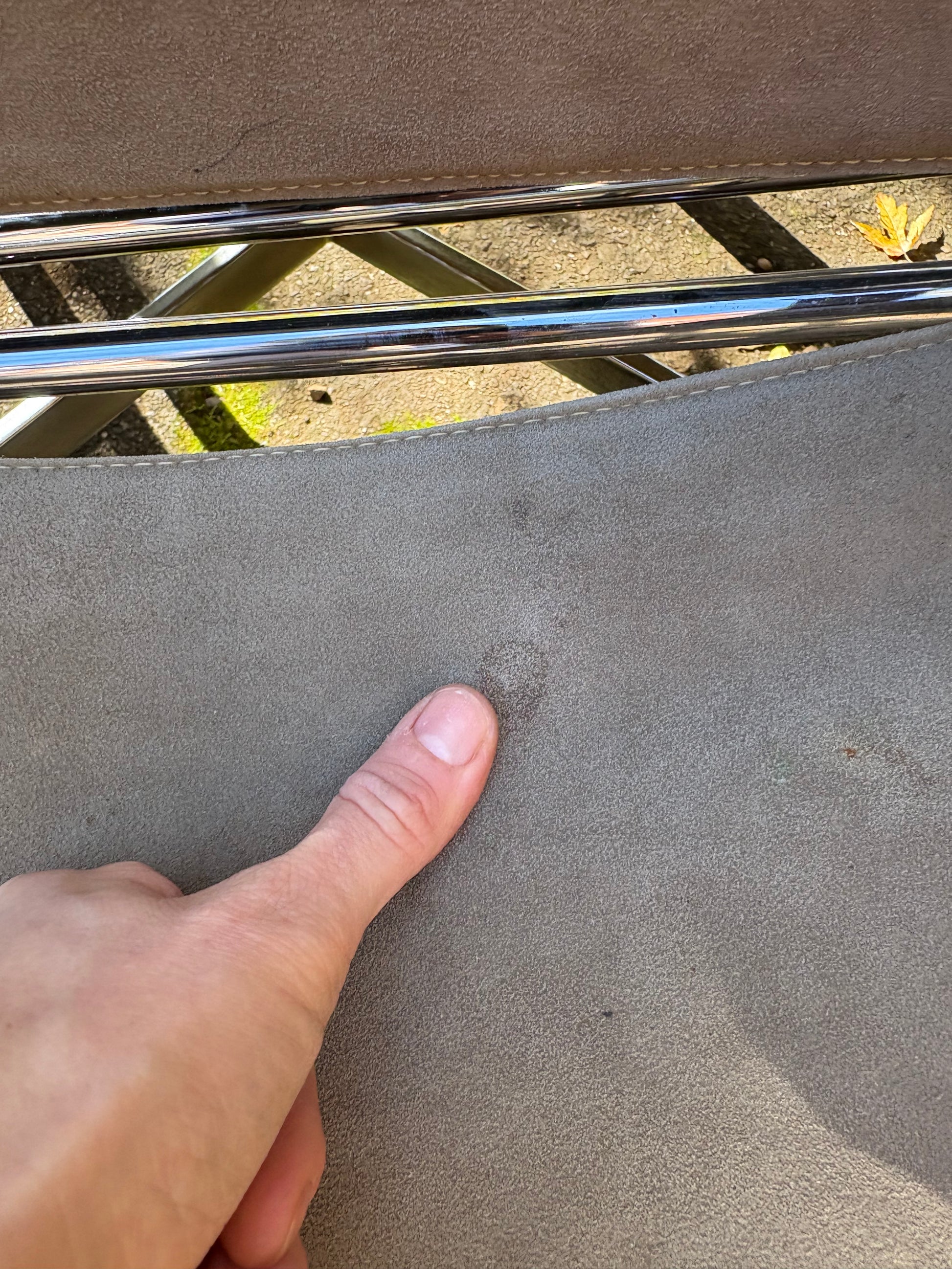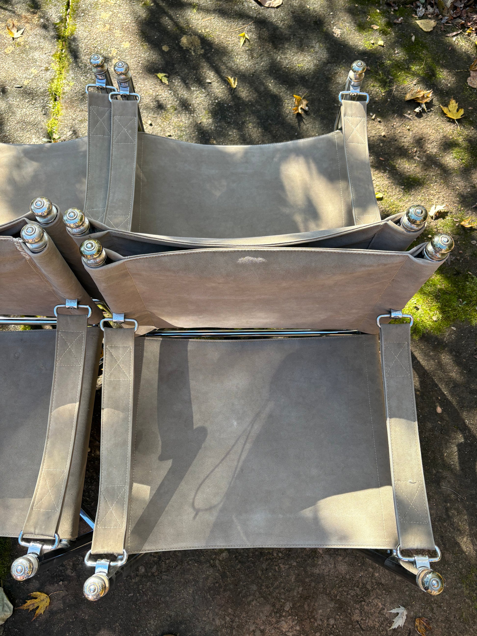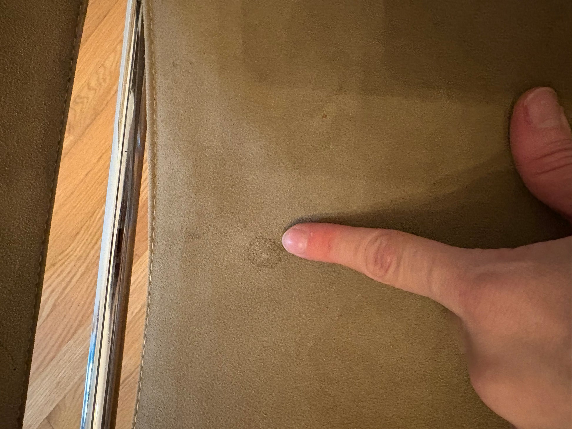 CONDITION: some areas of staining to the suede visible in picture. One chair has had back sewed back together. Doesn’t impact functionality.