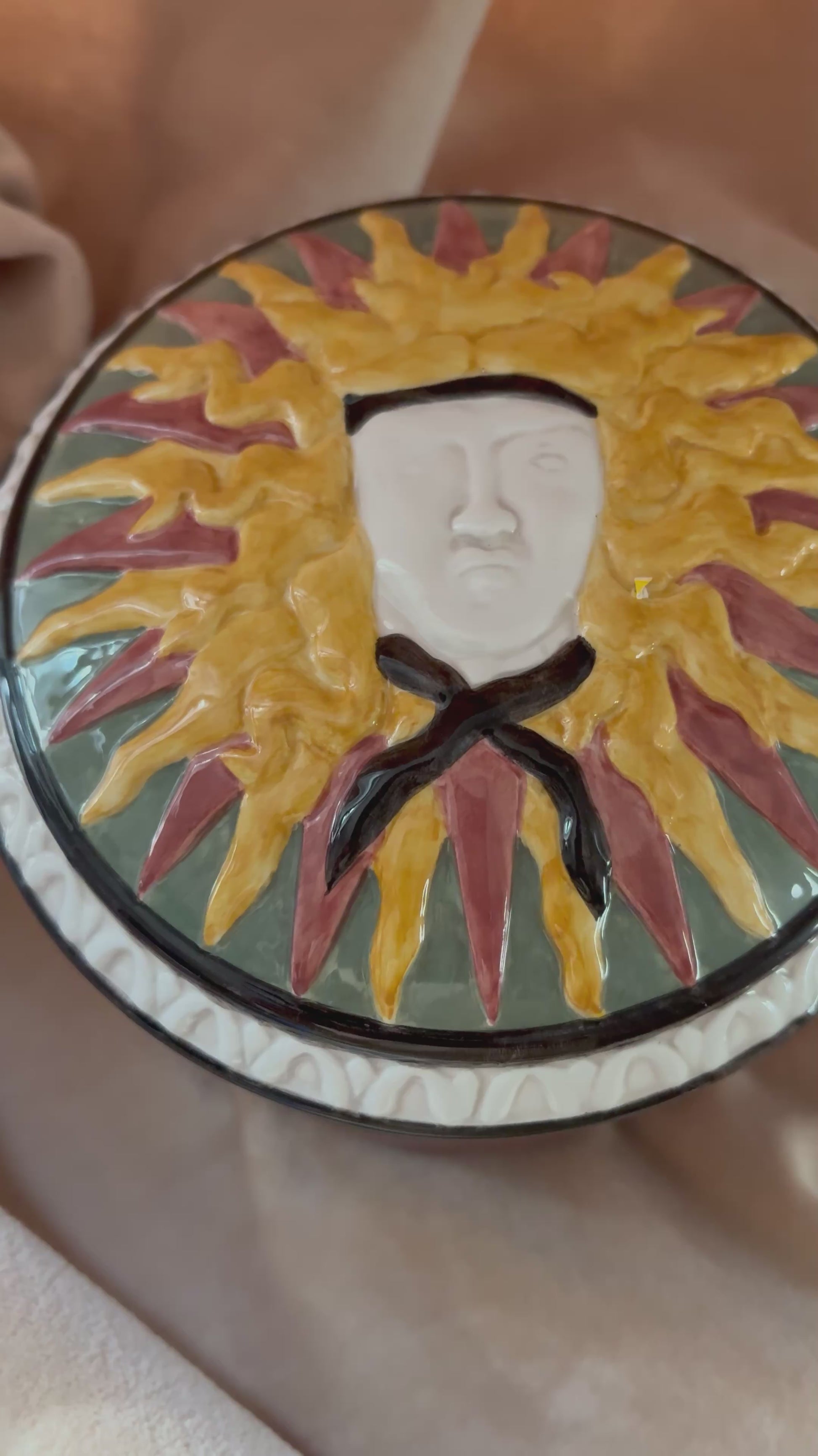 Lidded ceramic container with sun face on top and decorative optical art style design around base. Gold, rose pink, green and black coloring. Top and optical art portion are raised creating more dimension.