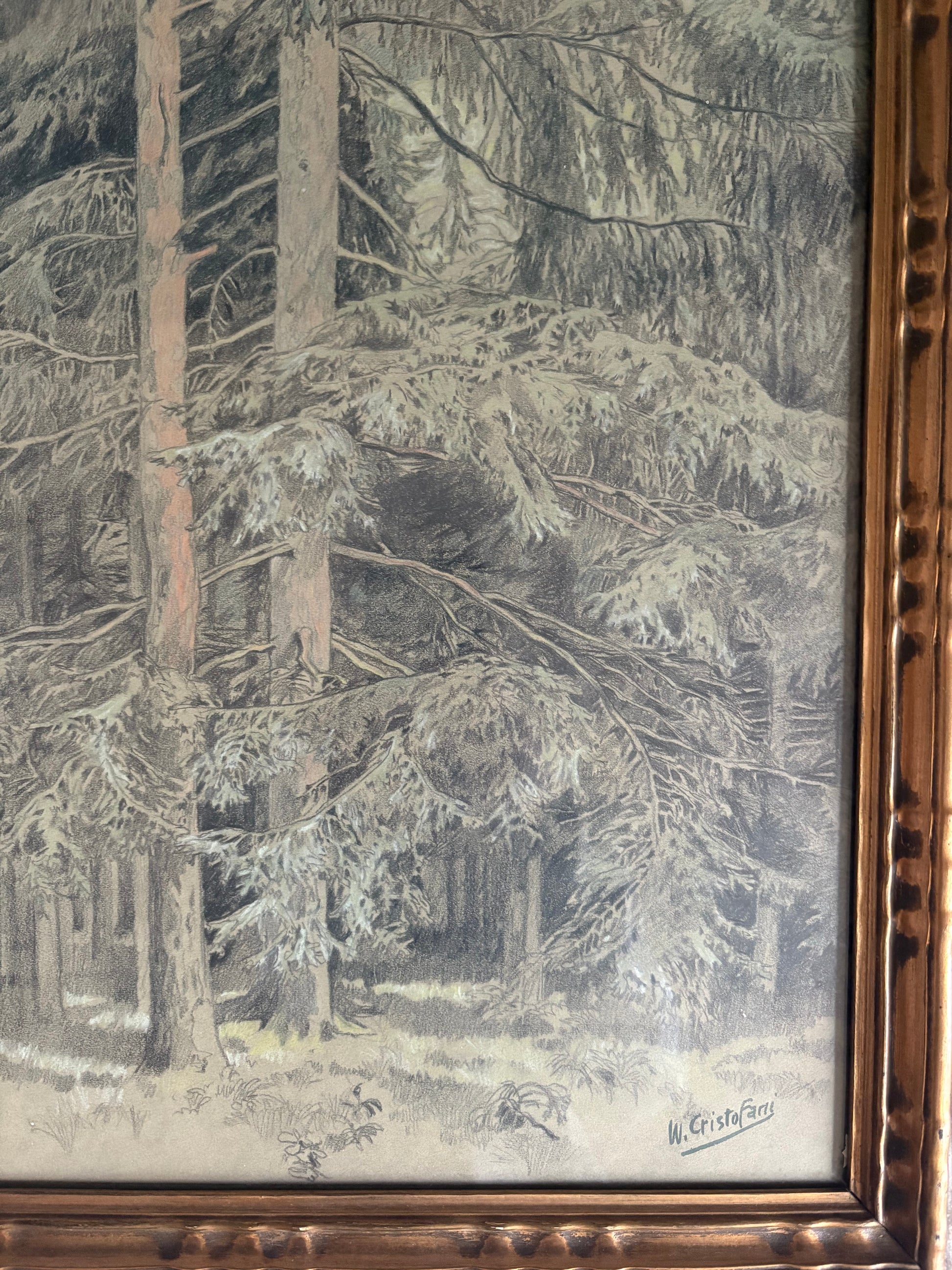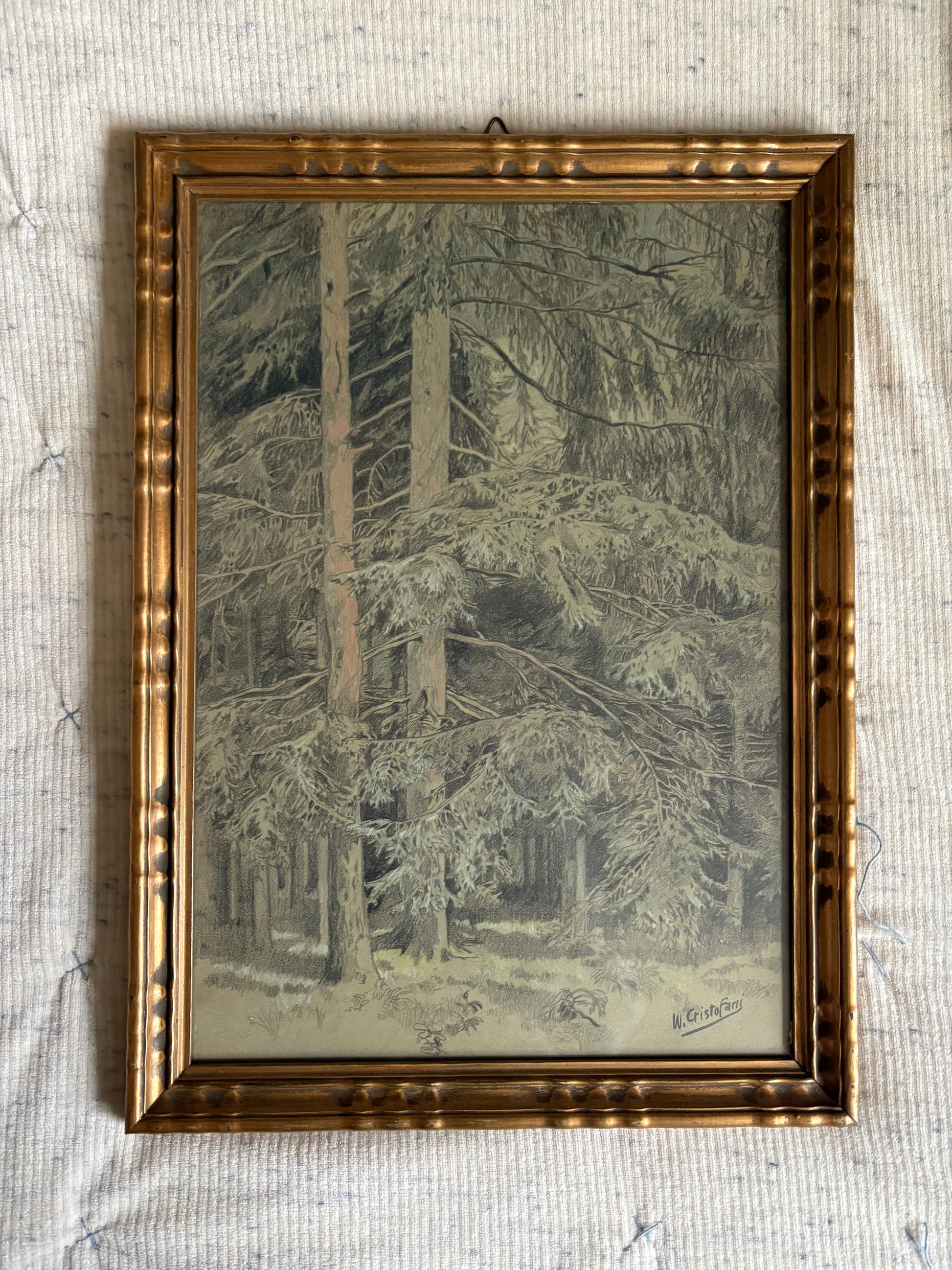 Original pastel and charcoal pencil drawing of a forest scene. Dated 1925 and signed W. CristoFarii with more information about the piece on the back. Made in France. Protected behind glass in a gilt frame. A truly incredible work of art that is highly detailed. Conveys real depth and movement. Subtle green and brown coloring that pairs perfectly with the original gilt frame.
