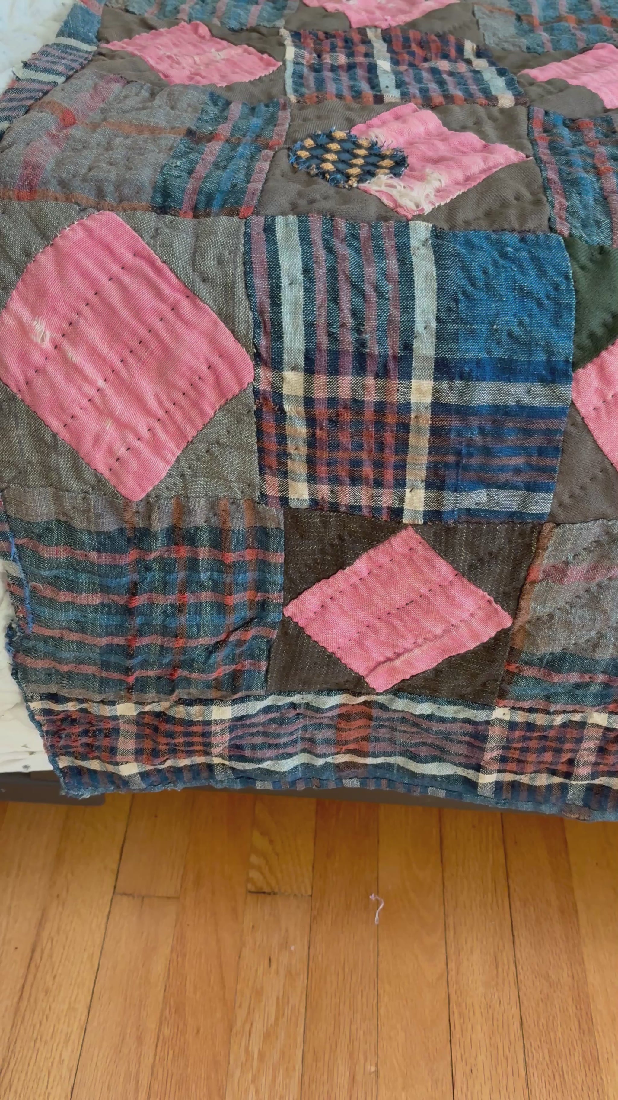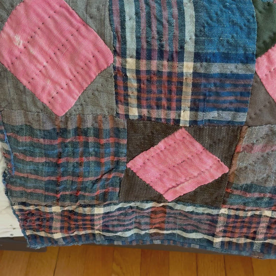 Early 1900s wool, patchwork quilt. Comprised of high contrast purple, blue and pink plaids interspersed with pink diamonds. Incredibly preserved color for the age. Mended with a Scalamandre velvet check fabric. Some areas of wear and mending present but in remarkable condition. This is a heavy weight and durable quilt. Freshly laundered.