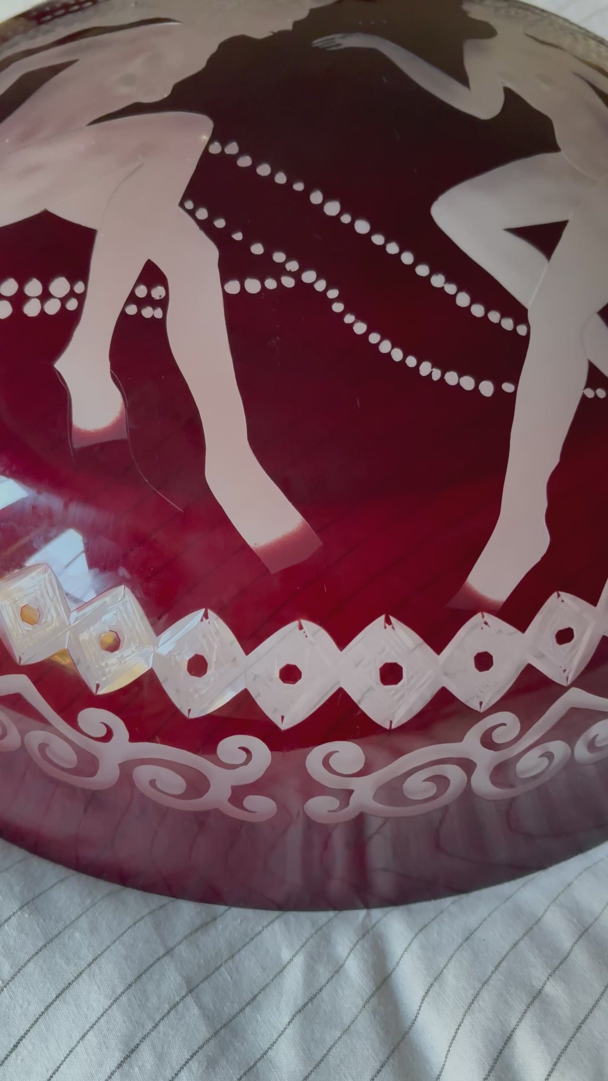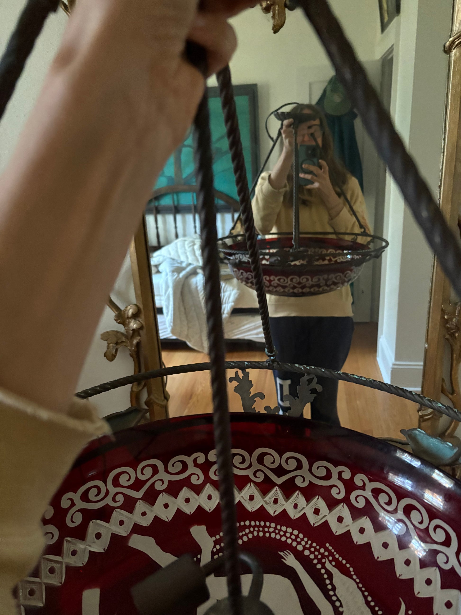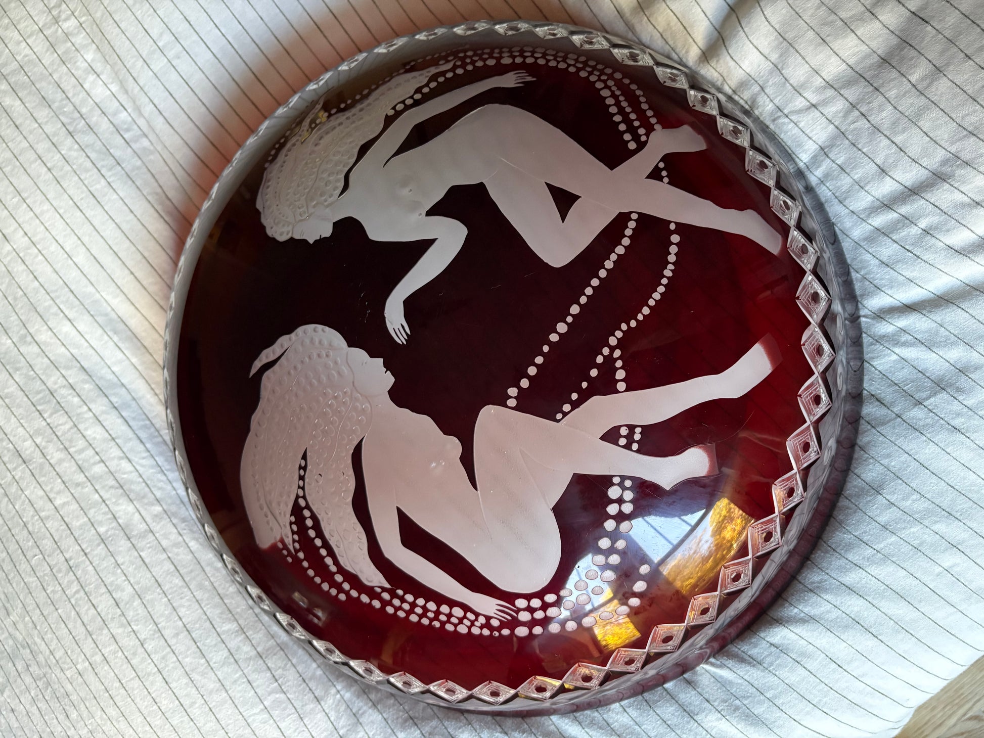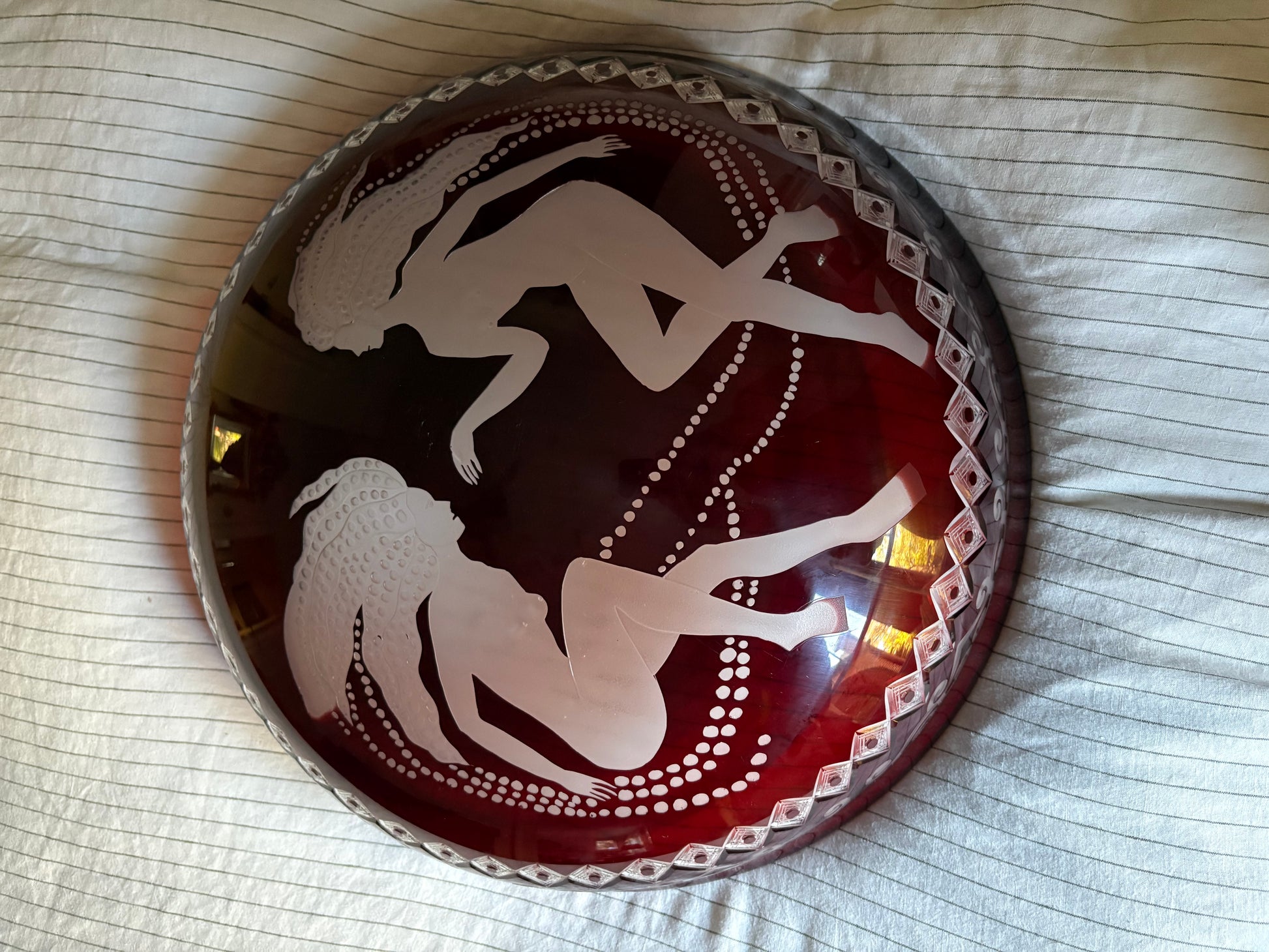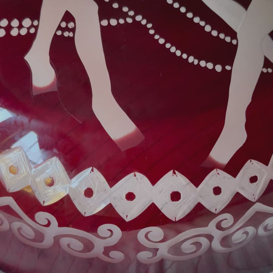 Custom made flycatcher style pendant light. Glass is red with Art Deco engravings of Rene Lalique style sirens and diamond and filigree pattern. Glass nests inside of a braided copper surround with bird and filigree details. Three braided copper “arms” connect the surround to the light fixture and canopy element. Wired for 2 bulbs.