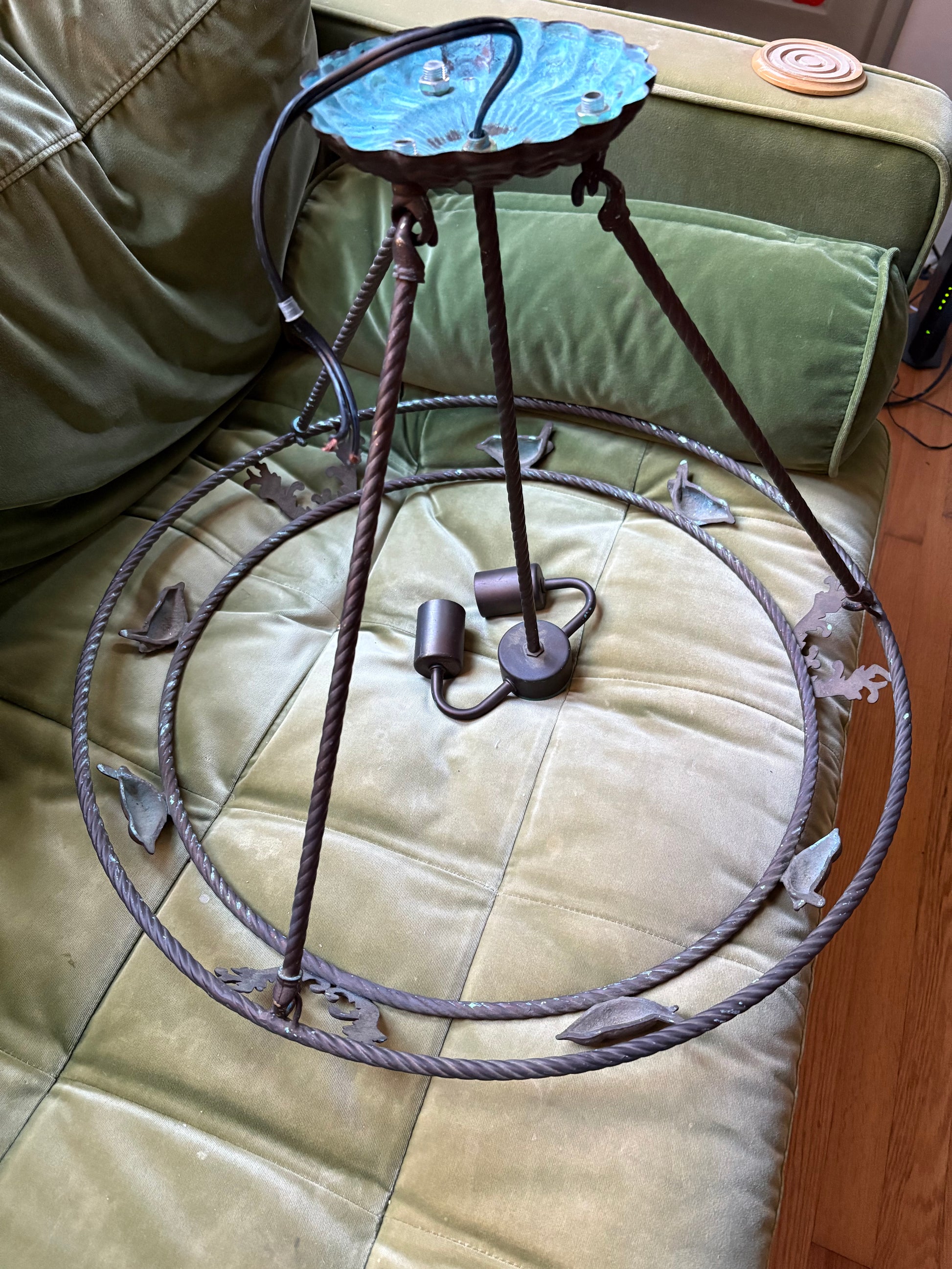CONDITION: wiring has been more recently updated; some scratching to the glass pendant visible in photos. Extra set of holes drilled into canopy for different widths of electrical box